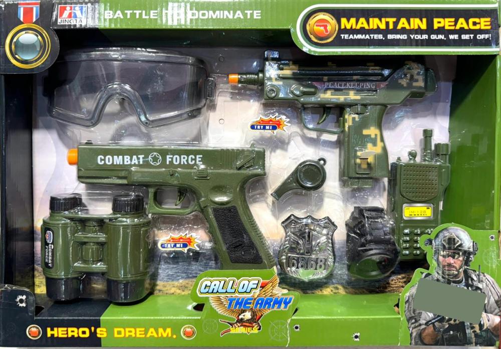- مسدس "COMBAT FORCE" أخضر: مسدس أخضر بتصميم كلاسيكي، يحمل شعار "COMBAT FORCE"، وربما يصدر أصواتًا أو أضواء (زر TRY ME).