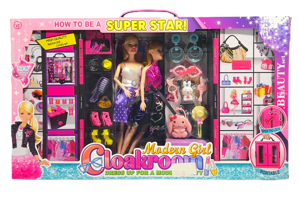 طقم يحتوي على دميتين والعديد من الاكسسوارات المتنوعه