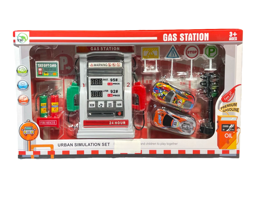 طقم محطة بنزين مع سيارتبن ومجموعه من اللوح الارشاديه